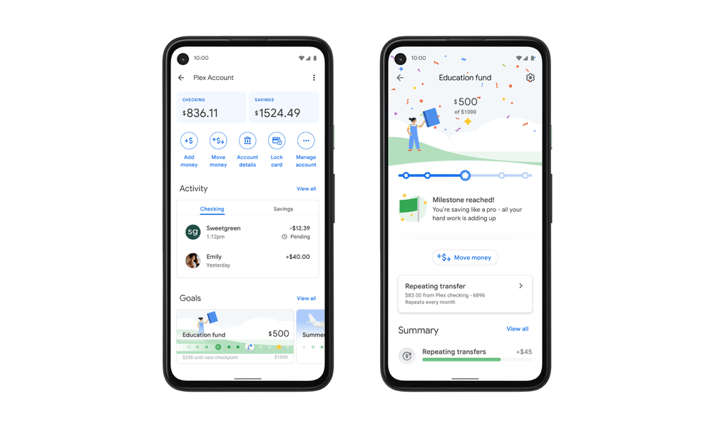 Por último, la aplicación presenta una nueva forma de realizar operaciones bancarias. Esta nueva función se llama Plex, y es una especie de cuenta bancaria que se integra a Google Pay. Las cuentas Plex son ofrecidas por bancos y cooperativas de crédito, incluyen cuentas corrientes y de ahorro sin cargos mensuales, cargos por sobregiro o requisitos de saldo mínimo y lo ayudan a ahorrar para alcanzar sus objetivos más fácilmente.