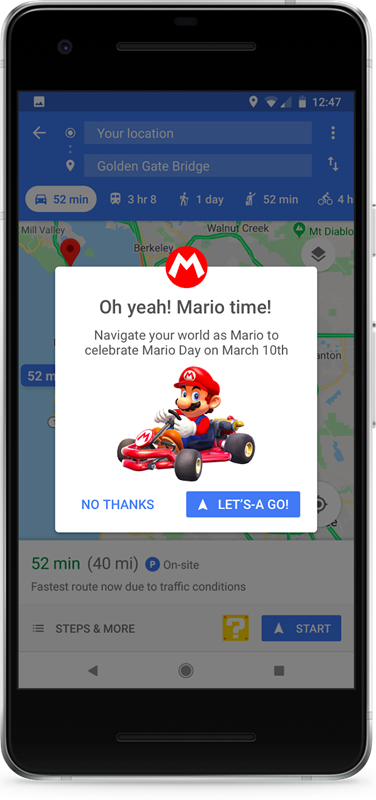 Google Maps se vestirá de Mario Kart por el día de mañana, dentro de la navegación guida será posible cambiar la clásica flecha azul por Mario conduciendo su famoso kart.