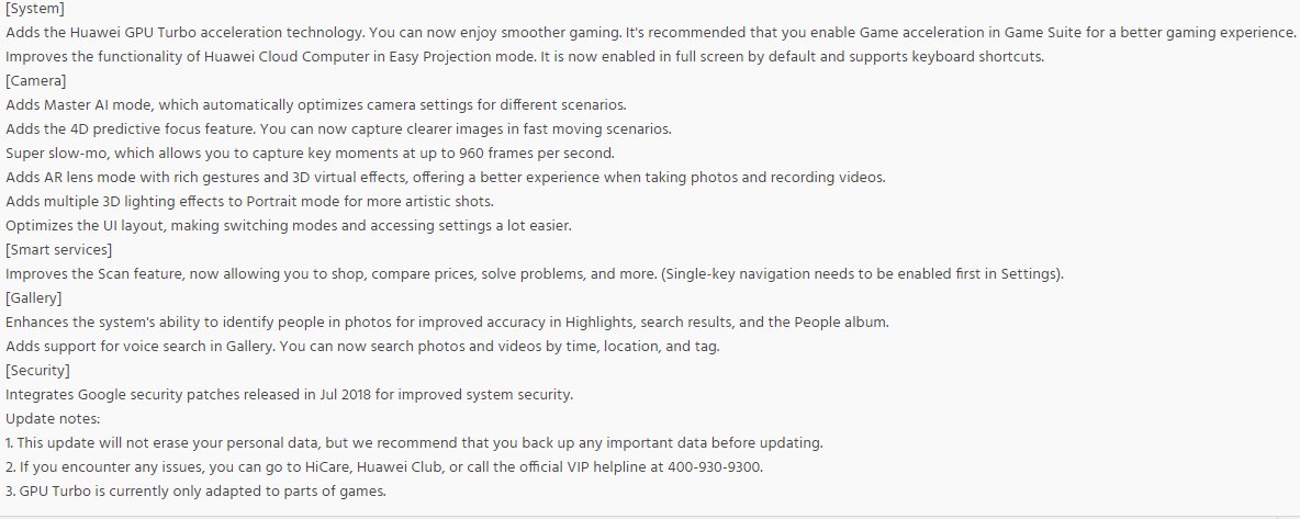 Gracias a la colaboración de nuestro amigo de Twitter @sbst1an tenemos el changelog de la actualización correspondiente para el Mate 10 Pro en donde se menciona la incorporación de la función GPU Turbo, además de otras novedades: