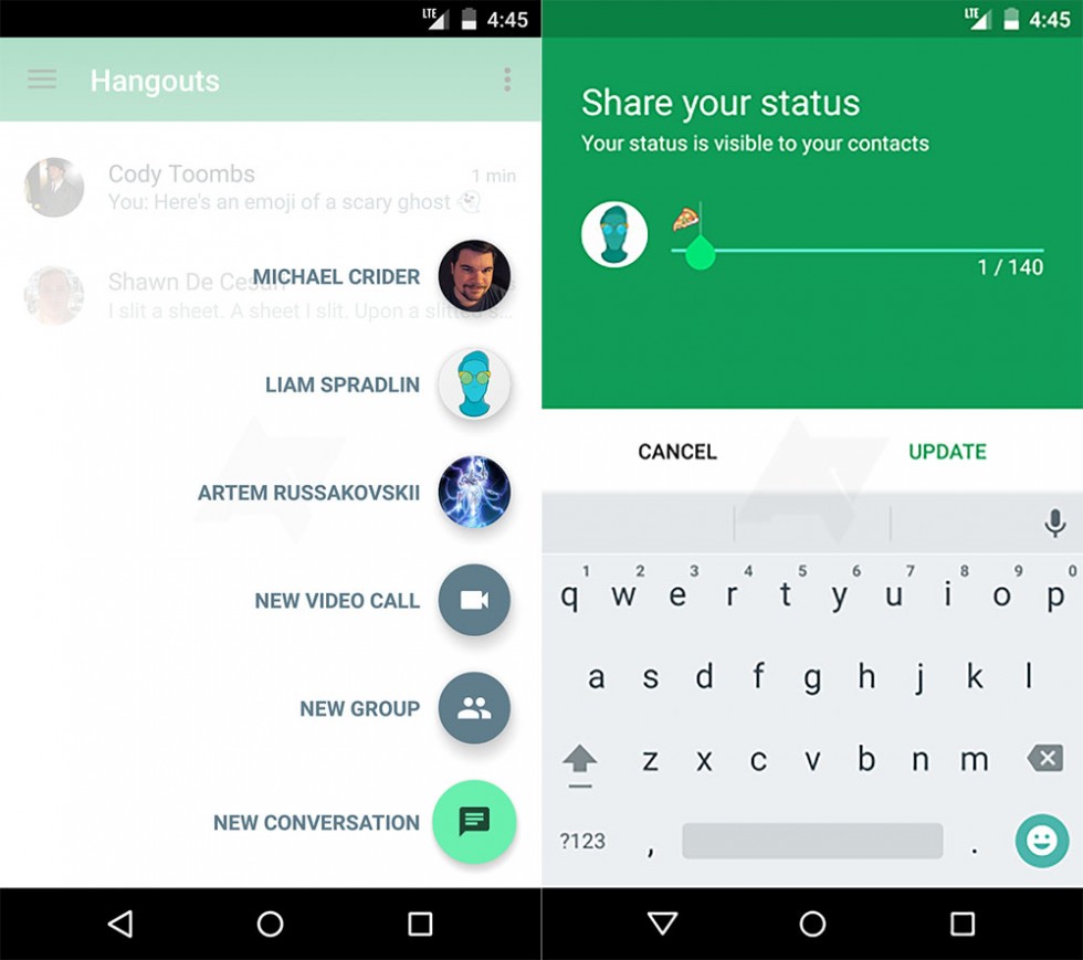 Hangouts 4.0 viene cargado de novedades para estar al día frente a la competencia como Messenger, WhatsApp, Telegram, Line, entre otras aplicaciones de mensajería instantánea. La novedades son gracias a los chicos del sitio web Android Police, donde podremos ver diversos cambios en la interfaz de usuario con un diseño aún más Material Design y redondeado, en una sola pantalla podrás ver la lista de contactos. También hay un acceso directo para iniciar una conversación, llamada de voz/video, crear un chat grupal, el acceso es muy similar al de Google Keep.