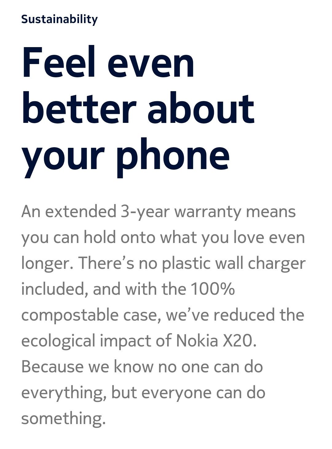 Una garantía extendida de 3 años significa que puede conservar lo que ama por más tiempo. No se incluye un cargador de pared de plástico y, con el estuche 100% compostable, hemos reducido el impacto ecológico del Nokia X20. Porque sabemos que nadie puede hacer todo, pero todos pueden hacer algo.