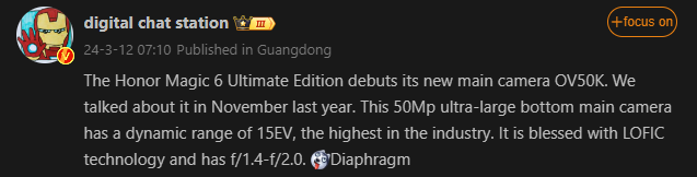 Esto se suma a la información de Digital Chat Station (vía GizmoChina), quien afirmó que el Honor Magic 6 Ultimate podría ser el primer debut con el sensor OmniVision OV50K. Este sensor consta de una cámara de 50 megapíxeles que ofrecerá una fotografía de categoría de buque insignia gracias a su apertura variable que va de f/1,4 a f/2,0. Incluso tiene un rango dinámico de 15 EV.