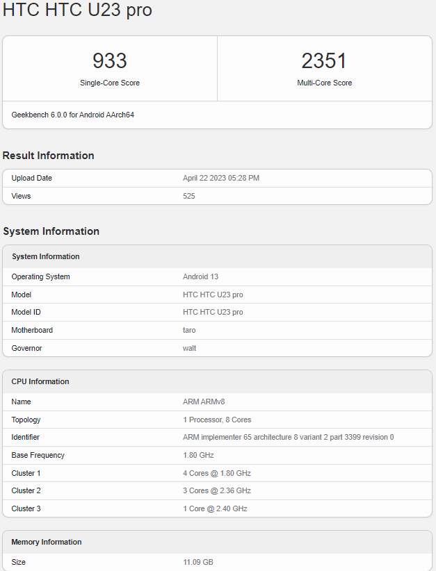 Y tenemos más por contar. El HTC U23 Pro 5G había aparecido en Geekbench. Allí se lo identificó como HTC HTC U23 pro.