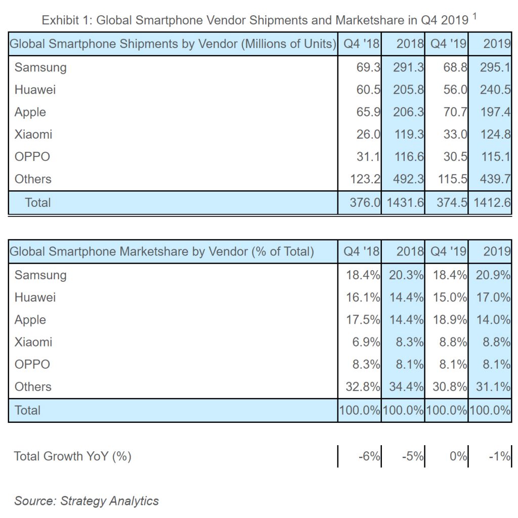 «Según la última investigación de Strategy Analytics, los envíos mundiales de smartphones se mantuvieron constantes en un crecimiento cero para alcanzar 375 millones de unidades en el cuarto trimestre de 2019».