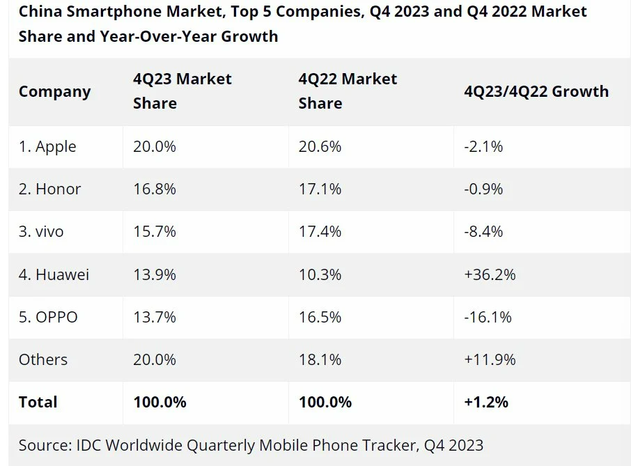 Hoy, según los datos de IDC, podemos ver que las cinco primeras marcas en términos de ventas fueron Apple, Honor, Vivo, Huawei y Xiaomi. Pero la novedad está en que Huawei experimentó un significativo aumento del 36.2% en los envíos en comparación con el año pasado, lo que la sitúa de nuevo entre las cinco primeras en la cuarta posición.