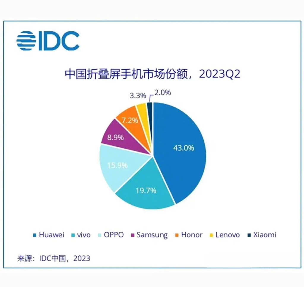 Tal como podemos ver en el gráfico, el 43% del mercado de plegables en el primer semestre en China es de Huawei. En segundo lugar, recién aparece vivo con un 19.7%. Para dicha empresa, el segundo lugar es inédito y en gran parte es gracias al éxito de los X Fold y X Flip.