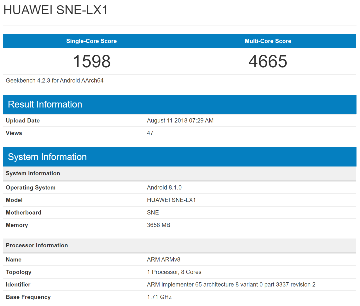 Su procesador está compuesto por ocho núcleos a una frecuencia máxima de 1,71GHz. Ante estos números, las deducciones no tardaron en coincidir y apuntalar al Kirin 710 como el SoC escogido para esta ocasión.