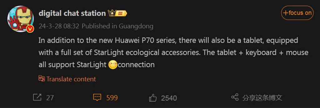 Hoy, el tipster @DigitalChatStation ha publicado en Weibo que Huawei lanzará una nueva tablet y estaría lleno de los últimos accesorios orientados a Nearlink. El informante también dijo que la nueva tableta será totalmente compatible con la tecnología Nearlink para sus accesorios, como un teclado y un ratón.