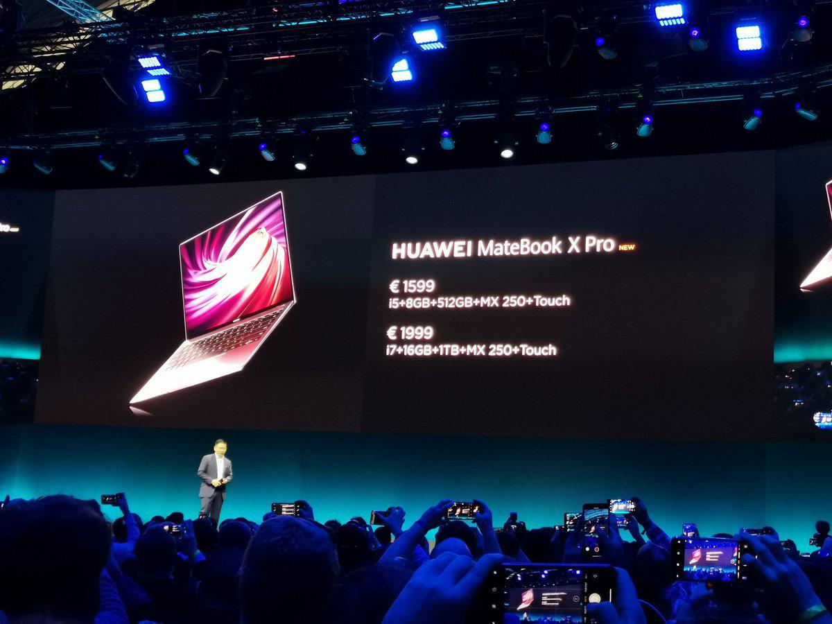 La primera en ser presentada, fue la renovación de su versión anterior, la Huawei MateBook X Pro (2019). La computadora que lleva su cámara en el teclado, se mantiene idéntica en cuanto a diseño, pero con mejoras internas. Entre estas mejoras podemos distinguir su nuevo procesador Intel Core i7, mejores gráficos, una mejor RAM, y un nuevo puerto Thunderbolt 3.