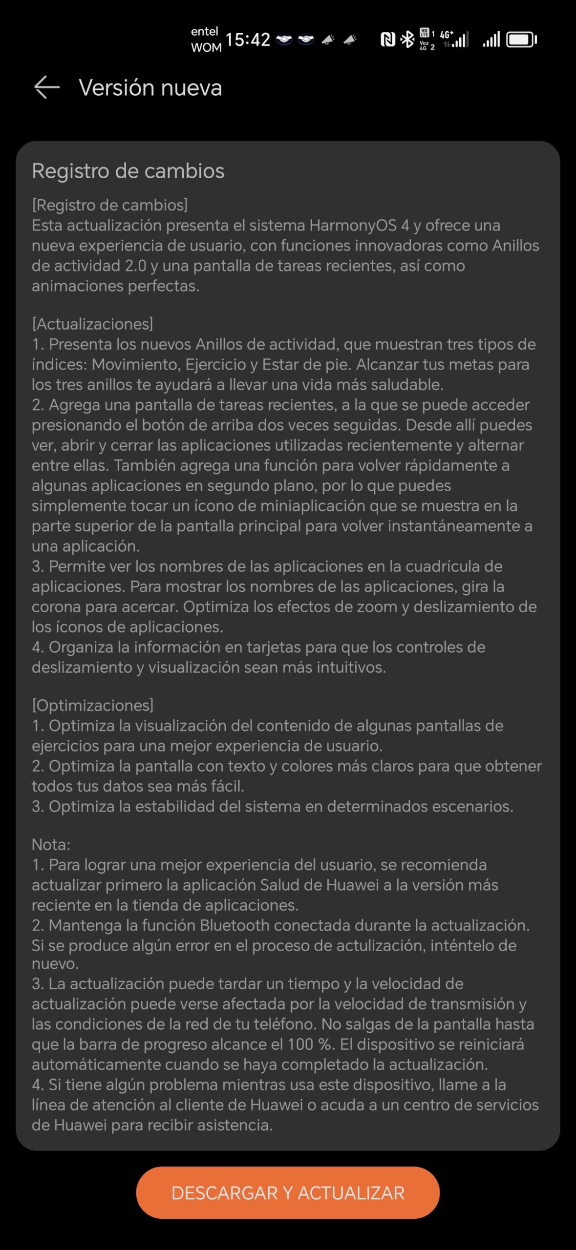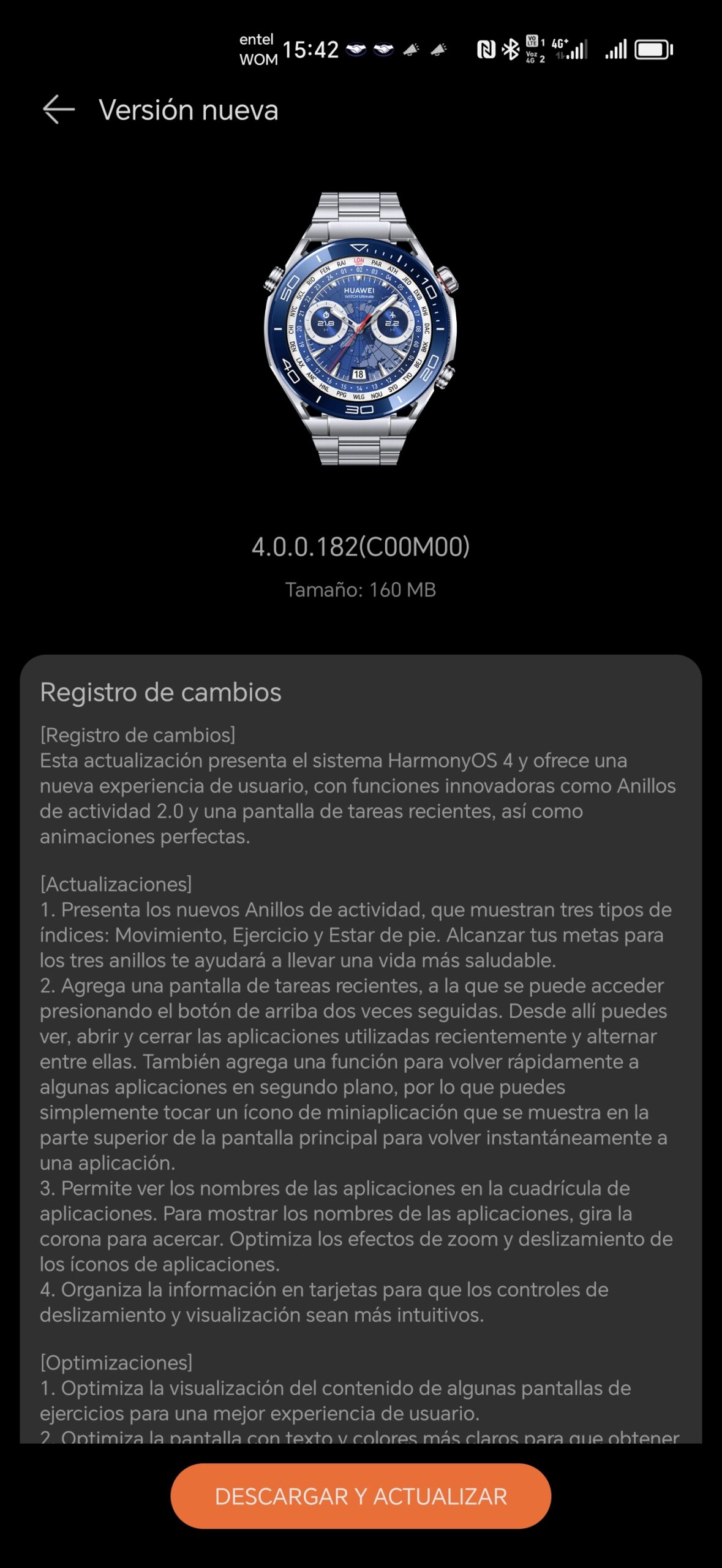 La actualización se identifica como 4.0.0.182 y se considera una actualización importante, ya que anteriormente el reloj operaba con la versión 3.0 del sistema operativo HarmonyOS y ahora pasamos a la versión 4.0.
