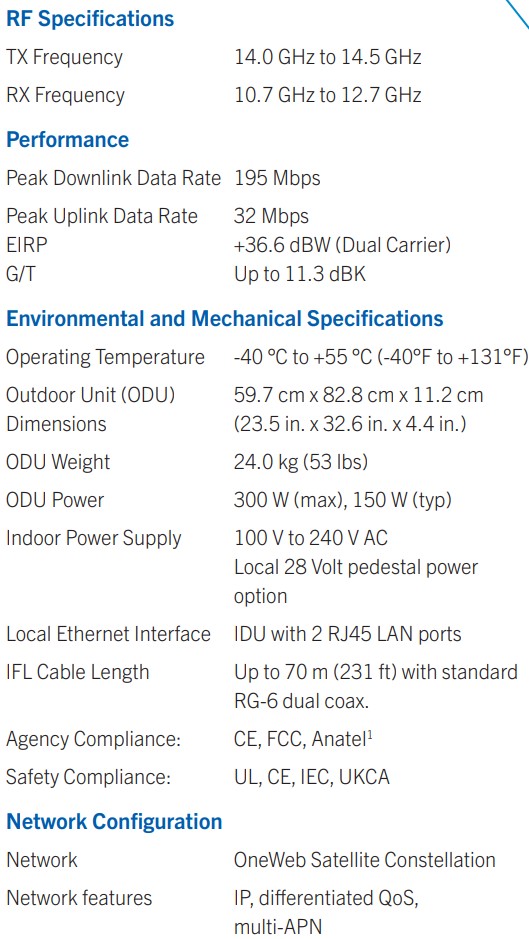 La antena HL1120W, producida en Maryland, EE.UU, está diseñada para uso exterior. Es ligera, consume poca energía, resiste condiciones climáticas adversas y es fácil de instalar y mantener. Posee un robusto chasis de aluminio y se auto alinea con la constelación de satélites Eutelsat OneWeb. Además, incluye una unidad interna que proporciona conectividad Wi-Fi 6 y dos puertos.