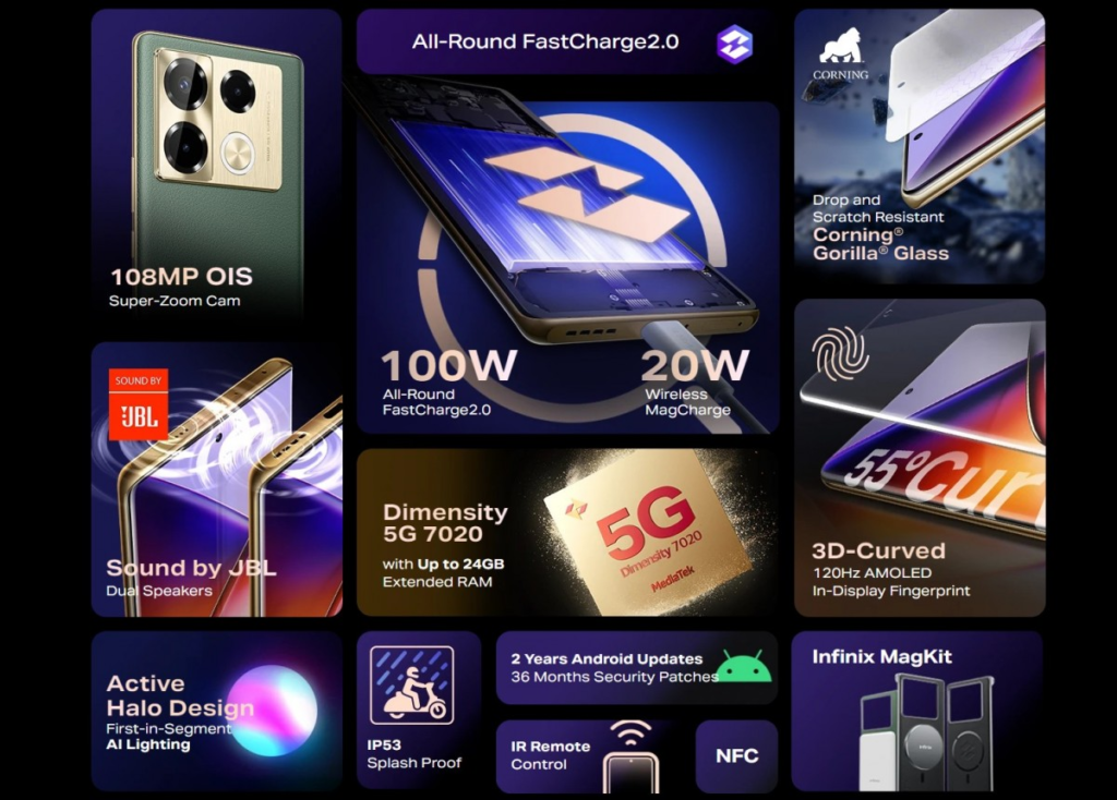 La pantalla está protegida por Gorilla Glass e Infinix también incluye un protector de cristal templado en la caja. El Infinix Note 40 Pro+ 5G tiene un procesador MediaTek Dimensity 7020. Además, viene con hasta 12 GB de RAM, que se pueden duplicar con RAM virtual y 256GB de almacenamiento interno.