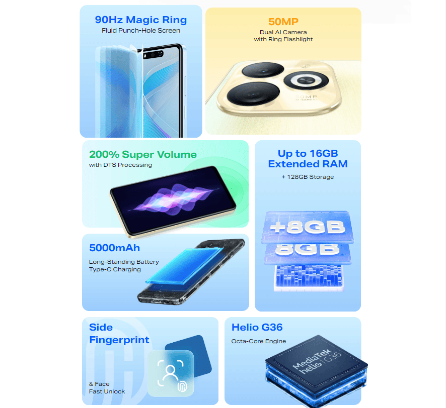 Así, el smartphone cuenta con un panel LCD perforado de 6.6 pulgadas que ofrece una resolución HD+ de 720 x 1612 píxeles y una tasa de refresco de 90 Hz. El Smart 8 Pro tiene como procesador el chipset MediaTek Helio G36.
