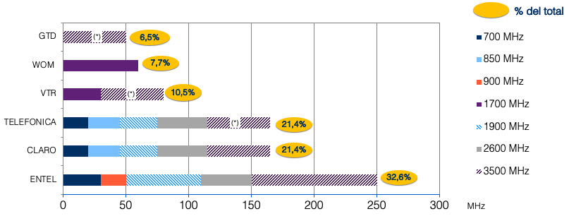 Esta ventaja de al menos dos años, por parte de Entel y Claro, se debe principalmente a la cantidad de espectro que estas tienen en la banda 3.5 GHz, frecuencia que será una de las licitadas según Subtel. En esta Entel cuenta con 100 MHz, mientras que Claro con 50 MHz.