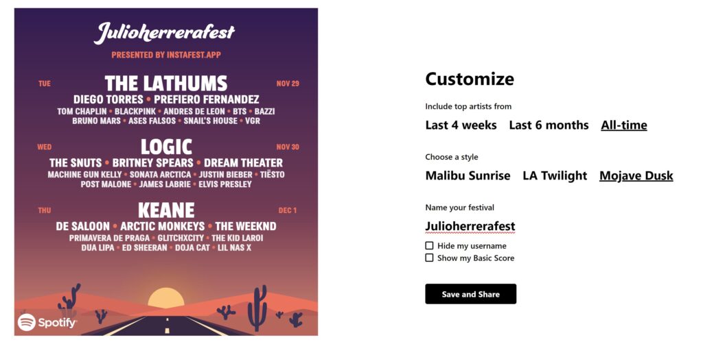 Para poder usarlo, simplemente tenemos que ir a la página de Instafest y desde ahí enlazar nuestra cuenta de Spotify o de Last.fm, donde se nos generará un cartel con el lineup de acuerdo a nuestros gustos para poder compartirlo en nuestras redes sociales favoritas.