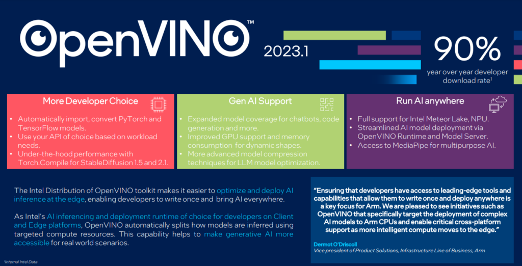 - OpenVINO 2023.1 permite a los desarrolladores optimizar modelos PyTorch, TensorFlow u ONNX estándar y ofrece compatibilidad total con los próximos procesadores Core Ultra. También proporciona más técnicas de compresión de modelos, mejor soporte de GPU y consumo de memoria para formas dinámicas, así como más portabilidad y rendimiento para ejecutarse en todo el continuo de computación: nube, cliente y Edge.