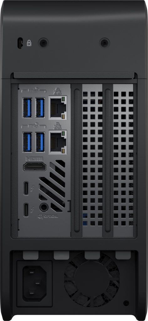 Te preguntarás ¿Por qué una fuente de poder de 500 Watts para un mini PC con tarjeta gráfica integrada? Bueno, esta nueva versión incluye un puerto PCIe x16 para tarjetas gráficas dedicadas. Sí, a este pmini PC puedes instalarle cualquier gráfica dual-slot que no sea de más de 8 pulgadas de largo. Por ejemplo, una Nvidia RTX 2070 Mini.