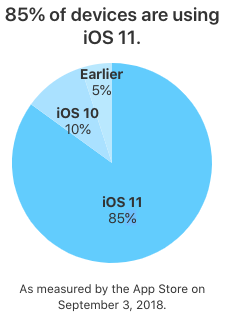 Según lo informado por la compañía, la versión 11 de iOS se encuentra presente en el 85% de los todos los iPhone y iPad que son compatibles con esta versión del sistema operativo de Apple, mientras que el 10% aún sigue con iOS 10 y el 5% tiene versiones anteriores.