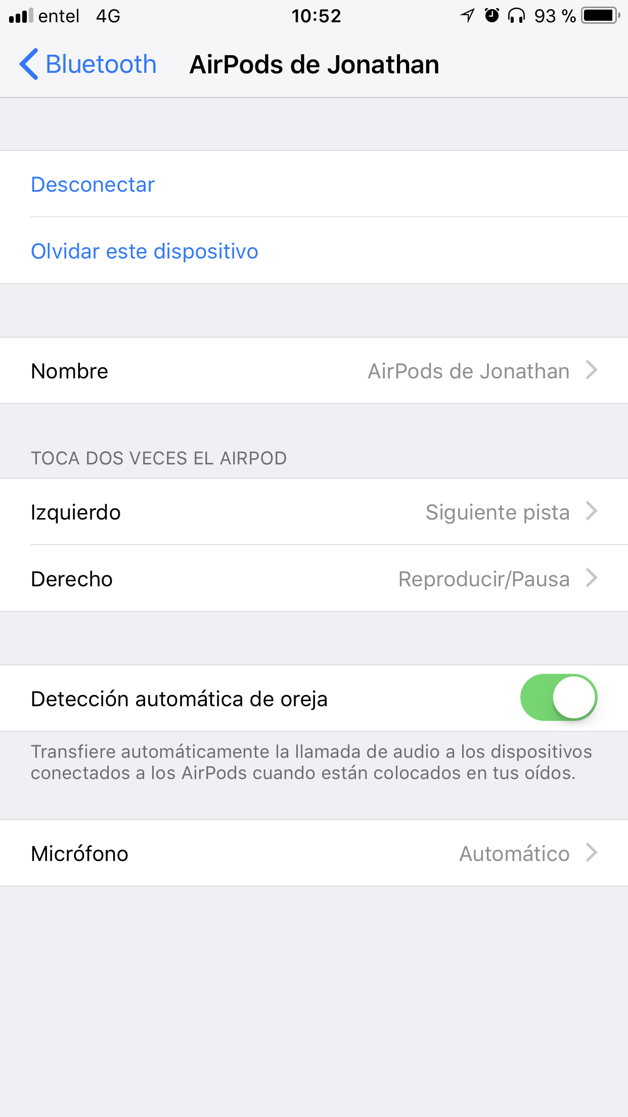 Para cambiar este ajuste deberás ir a Configuración – Bluetooth y ahí deberás presionar sobre la «i» que se encuentra ubicado al lado derecho del nombre de tus AirPods.