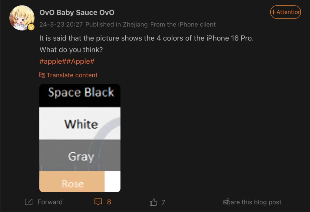 Recordemos que actualmente, los colores en que está disponible el iPhone 15 Pro son titanio natural, negro, blanco y azul. El filtrador dice en el post de Weibo que el azul se ha eliminado de las opciones de tonalidades para el iPhone 16 Pro.