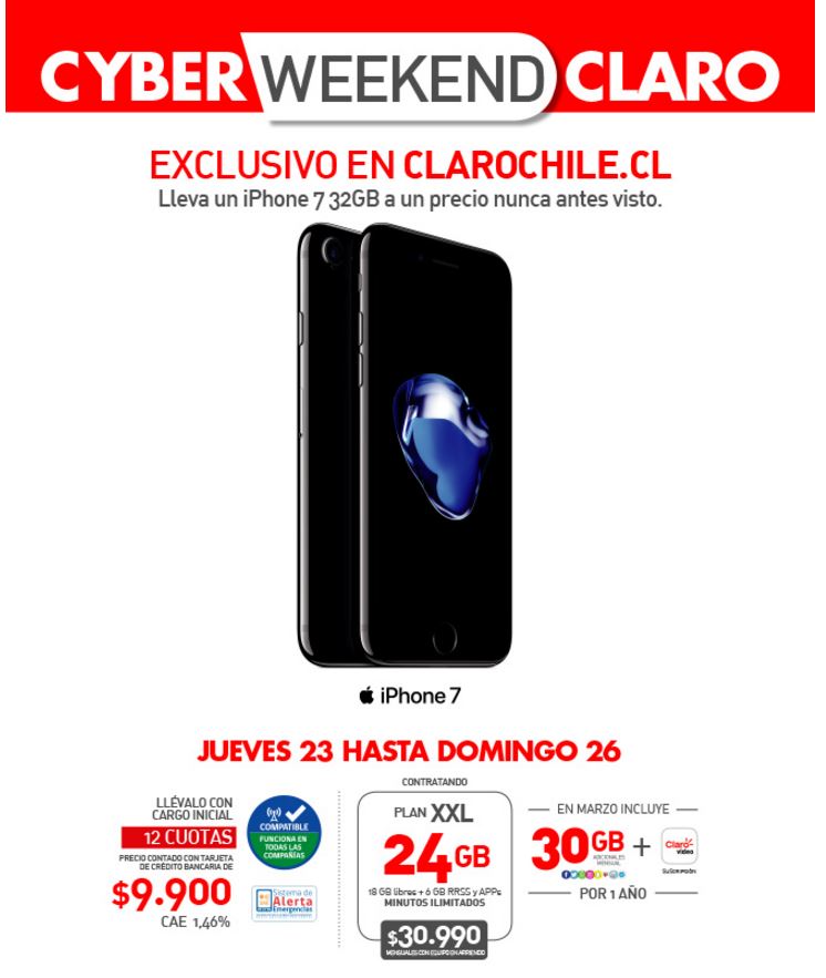 El iPhone 7 está en oferta con un plan XXL de 24GB que tiene un costo mensual de CLP $30.990 CLP, con 30GB adicionales al plan para redes sociales y Claro Video.