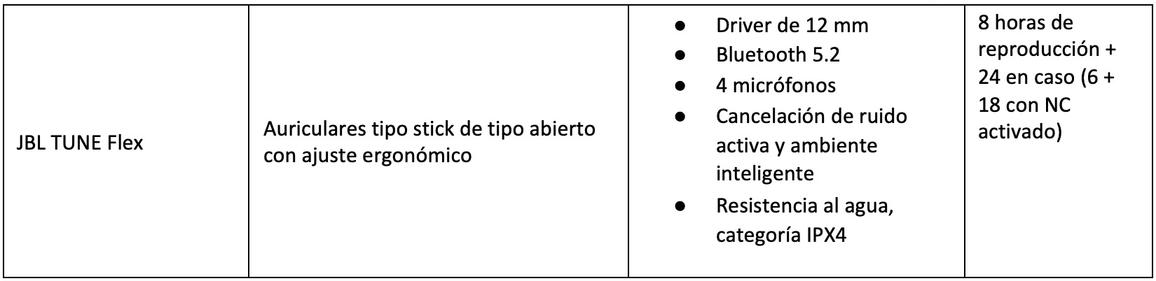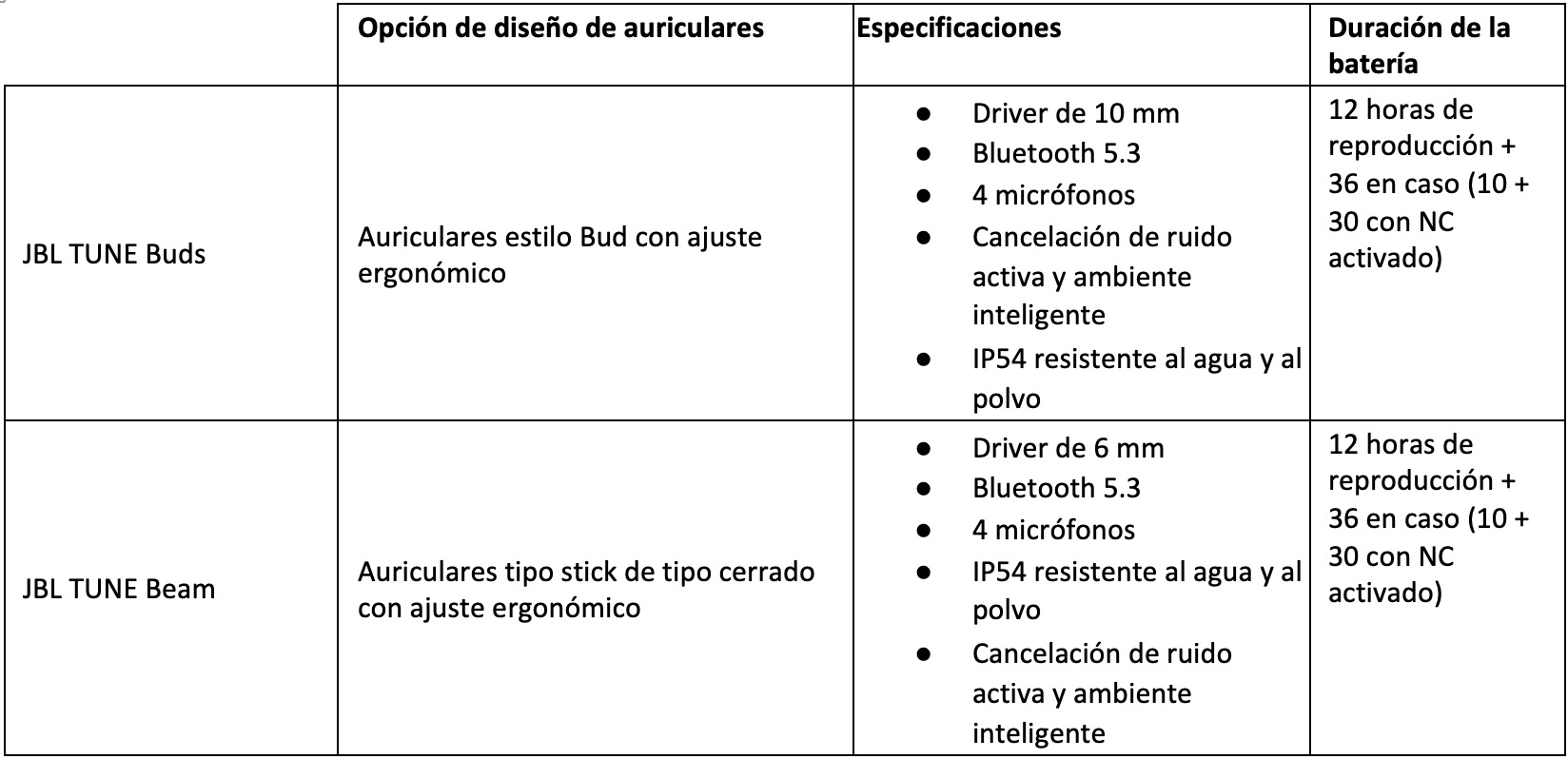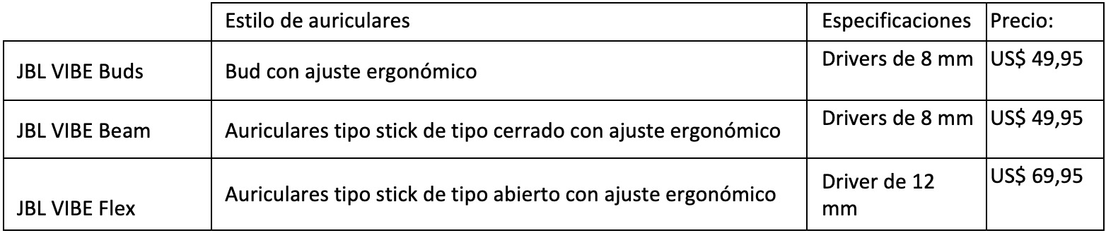 Son seis nuevos modelos: JBL TUNE Buds, JBL TUNE Flex y JBL TUNE Beam, y JBL VIBE Buds, JBL VIBE Beam y JBL VIBE Flex.