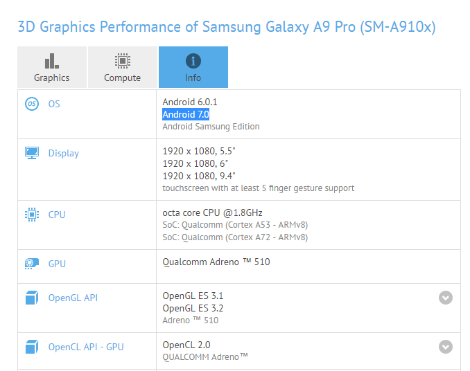 Pero hoy en GFXBench ha aparecido un Galaxy A9 Pro corriendo Android 7.0. El dispositivo con nombre clave SM-A910x apareció en el popular sitio de benchmarks, lo que significa que dicha actualización está ya probada y certificada, por lo que Samsung ya tiene todas las herramientas para poder hacerla oficial.