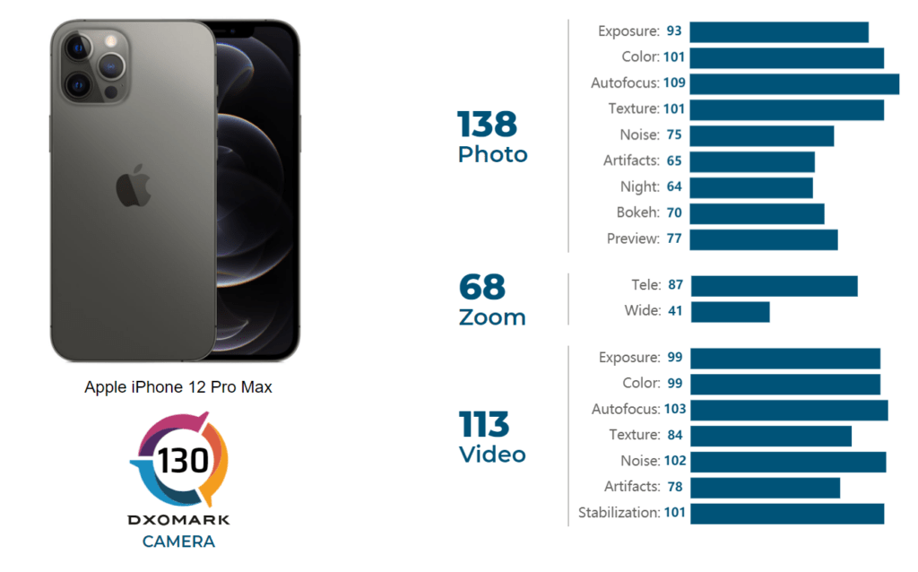 El nuevo iPhone quedó en el cuarto lugar del ranking de cámaras de DXOMARK, obteniendo 130 puntos en general, superando por solo dos puntos al iPhone 12 Pro el cual obtuvo 128 puntos y quedándose con el quinto lugar.