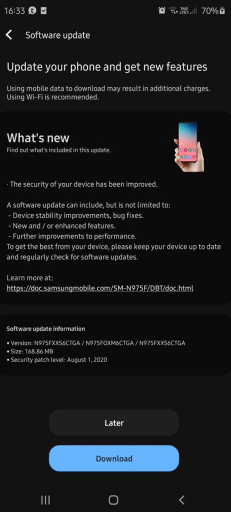 Los terminales de Alemania son los primeros afortunados en gozar de este update. De hecho, quienes tomaron la iniciativa son los Note 10 Plus en su variante internacional, es decir, con procesador Exynos (SM-N975F). La descarga pesa casi 169MB y el número de versión de firmware es N97xFXXS6CTGA.