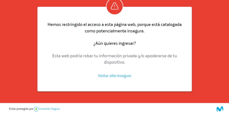 De esta manera, cuando un cliente que ya cuenta con «Conexión Segura» e ingresa a una URL que derive a algún malware, la red de Movistar enviará una advertencia para indicarle al usuario que se trata de un engaño. Sin embargo, el cliente tendrá la opción de regresar a un sitio seguro o continuar bajo su responsabilidad al sitio.