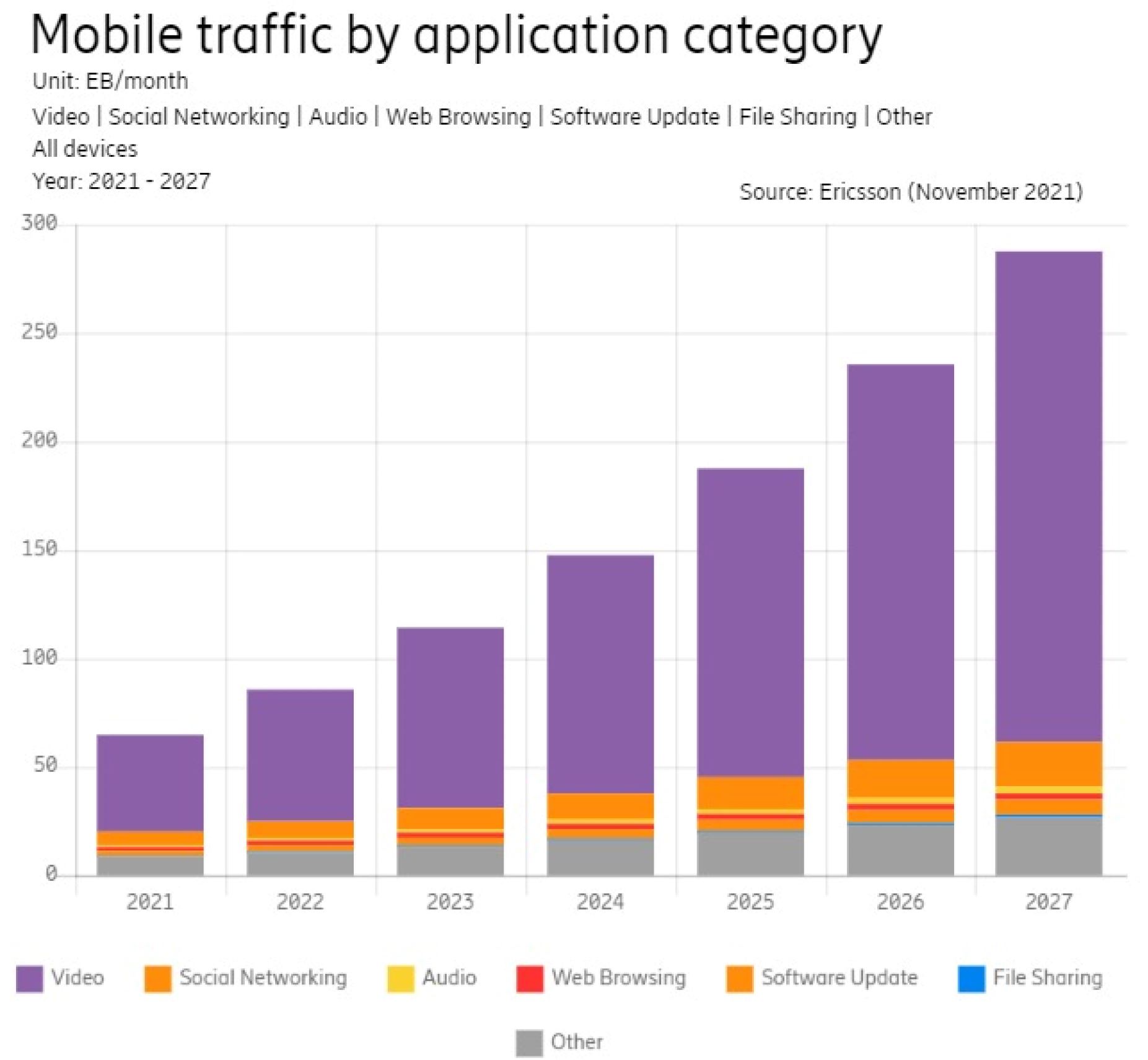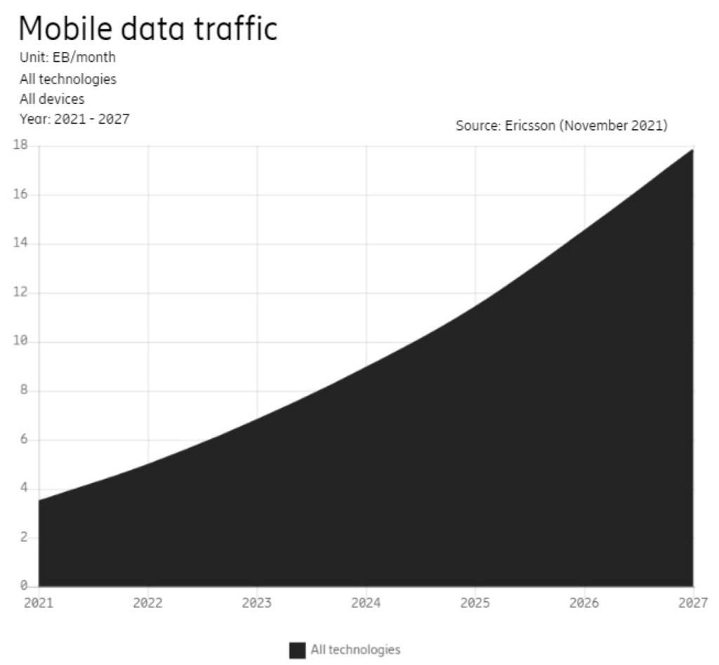 Desde Ericsson, indican que a 2021 el tráfico mensual promedio es en torno a 3 exabytes y que para el año 2027 se espera que ese promedio se multiplique por 6.