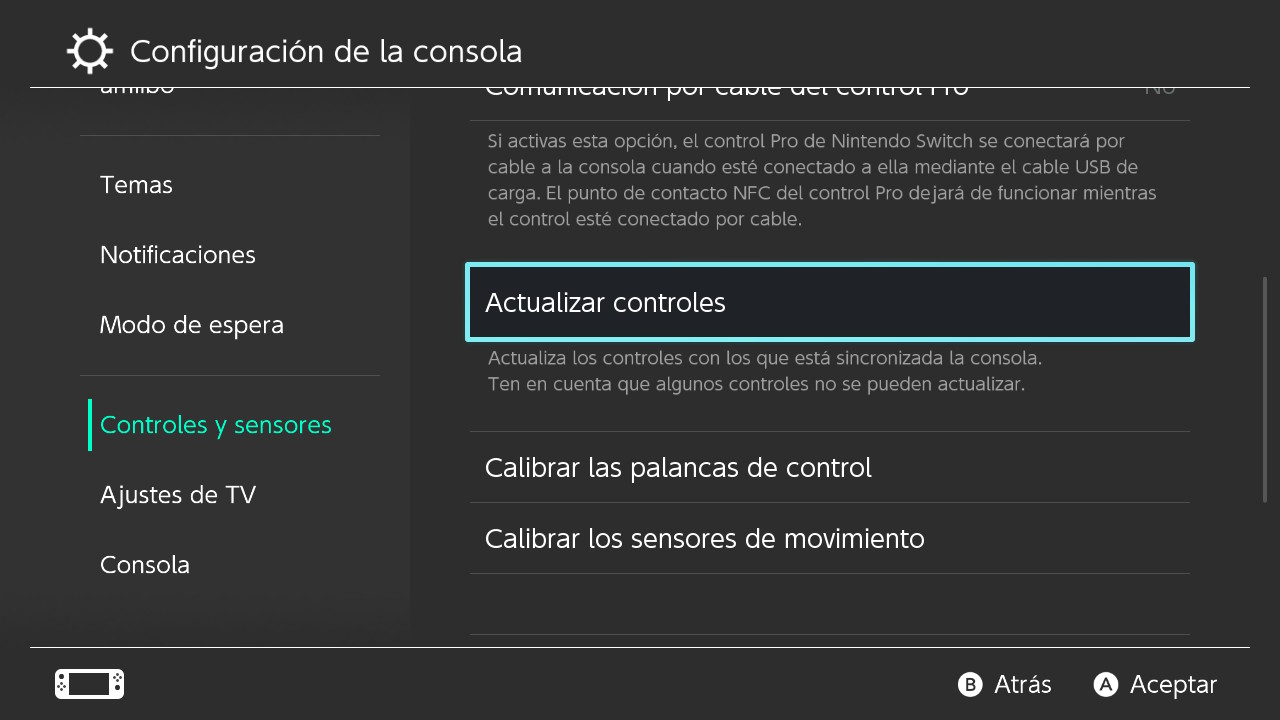 Es súper fácil, solo debemos ir a Configuración de la consola, nos movemos hasta la opción llamada “Controles y sensores” y luego seleccionamos la opción “Actualizar controles”.