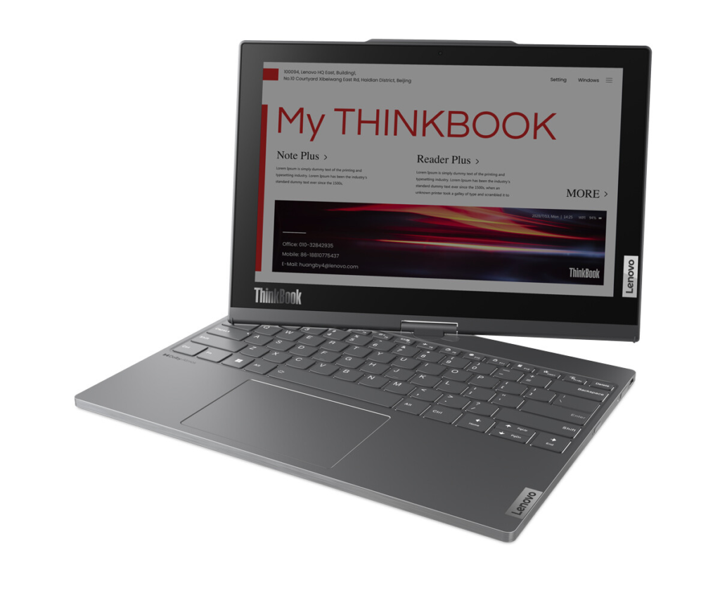 La ThinkBook Plus es un laptop que como principal novedad tiene una pantalla OLED de 13.3 pulgadas con resolución 2.8K que rota para dar paso a otra pantalla, esta vez de tinta electrónica a color de 12 pulgadas con tasa de refresco de 12 Hz, pero que bien puede funcionar como el monitor principal de la computadora.
