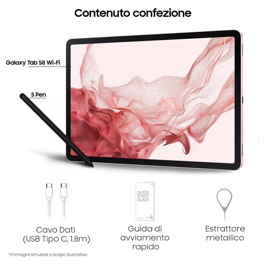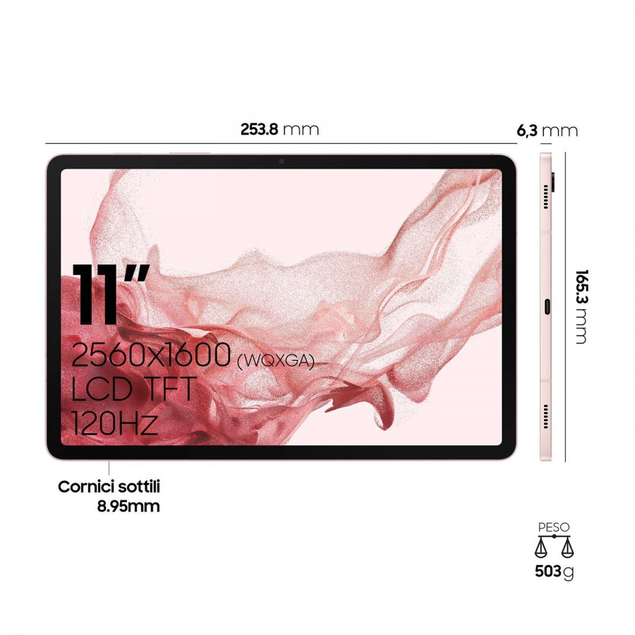 El modelo normal de la serie, Galaxy Tab S8, cuenta con una pantalla LCD de 11 pulgadas que ofrece 2560 x 1600 píxeles de resolución y una frecuencia de actualización de 120Hz. Está equipado con una batería de 8000 mAh la cual es compatible con carga rápida de 45W. El dispositivo mide 253,8 x 165,3 x 6,3 mm y pesa 503 gramos.