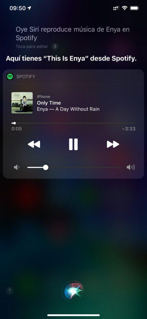 Solo debemos decir “Oye Siri”, seguido del artista o canción que queramos escuchar y tenemos que decir por obligación que lo haga en Spotify, ya que de lo contrario lo hará en Apple Music. Por ejemplo: “Oye Siri, reproduce música de Enya en Spotify”.