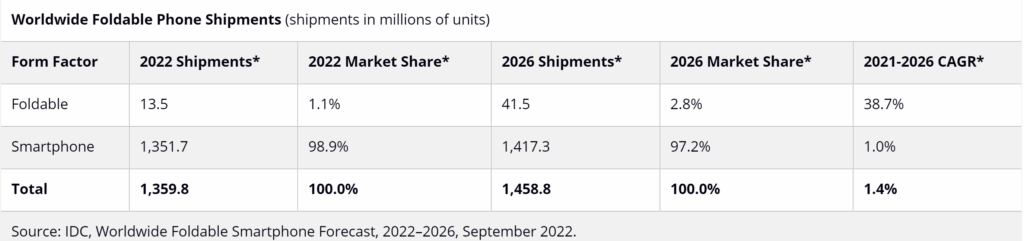 Así, este 2022 ya tenemos 13.5 millones de plegables vendidos, lo que representa una cuota de mercado de un 1.1%, y se espera que para 2026 ya se doblen las ventas llegando a un previsto 2.8% de cuota de mercado total.