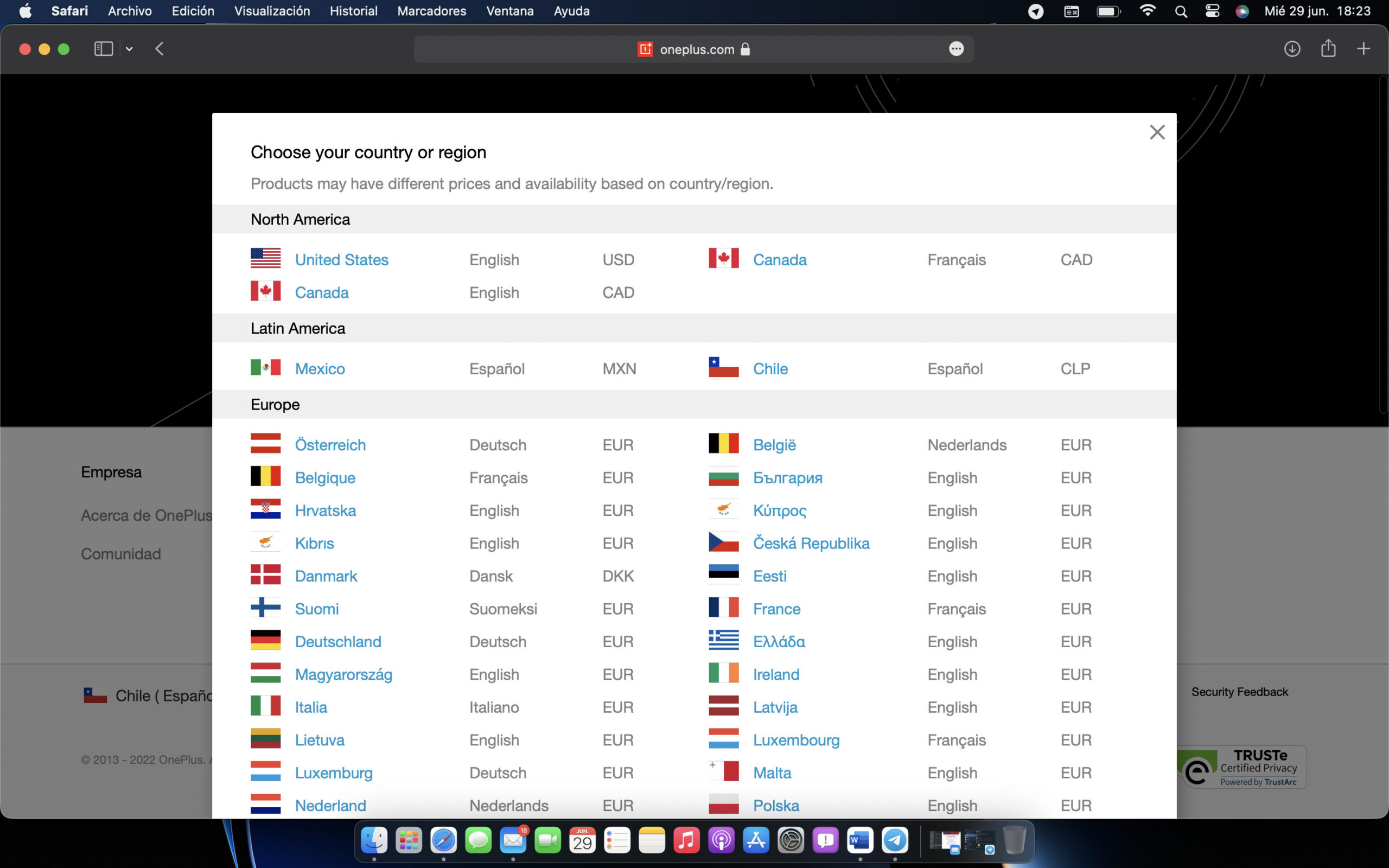 Incluso, si abrimos la lista de países donde están presentes en su web oficial, en el apartado de Latinoamérica aparece México y Chile, y al seleccionar nuestro país, nos redirige a www.oneplus.com/cl, lo que demuestra la autenticidad de este link.