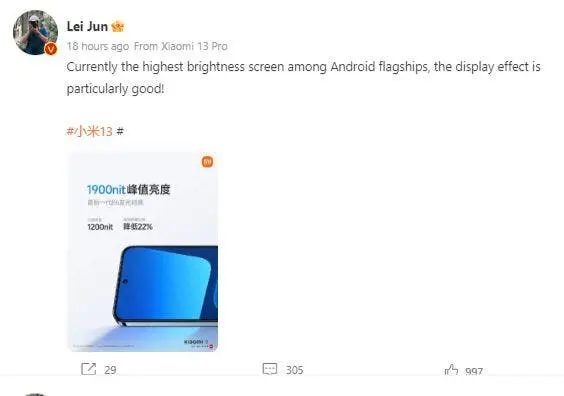 Y justamente de eso es lo que se ha referido Lei Jun, presidente de Xiaomi, quien en su página oficial de Weibo ha declarado que está orgulloso de que la pantalla del Xiaomi 13 es la mejor de todas en términos de brillo.