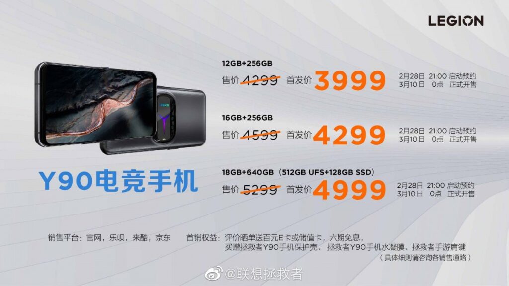Como era de esperarse, el Lenovo Legion Y90 estará disponible en China y las ventas parten el 10 de marzo. El modelo de 12/256 GB tiene un sugerido de CNY 4,300 (USD$680), pero se cuenta a CNY 4,000 para celebrar el lanzamiento. El modelo de 16/256 GB es CNY 4.600 (sin descuento), el de 18/640 GB es de CNY 5.300.