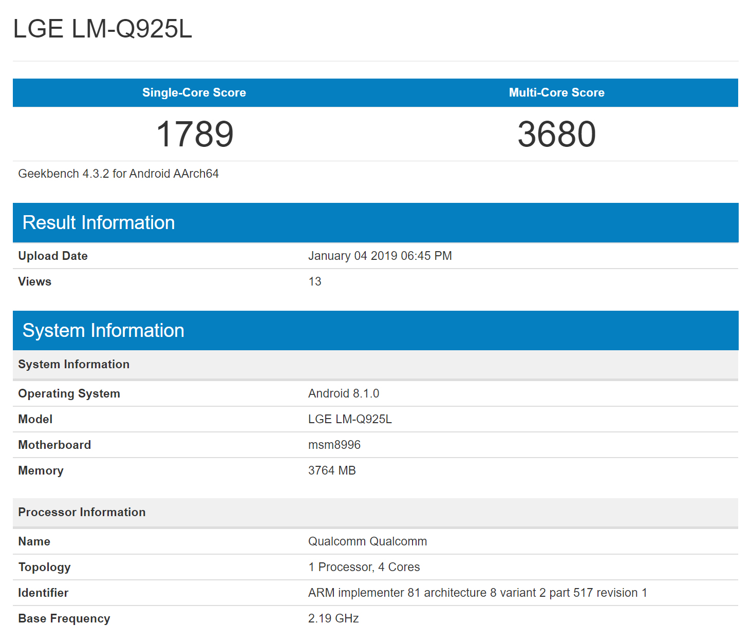 La imagen superior a estas líneas es la correspondiente a Geekbench. El LG Q9 tiene el número de modelo LM-Q925K/L/S. Posee 4GB de RAM y Android 8.1 Oreo.