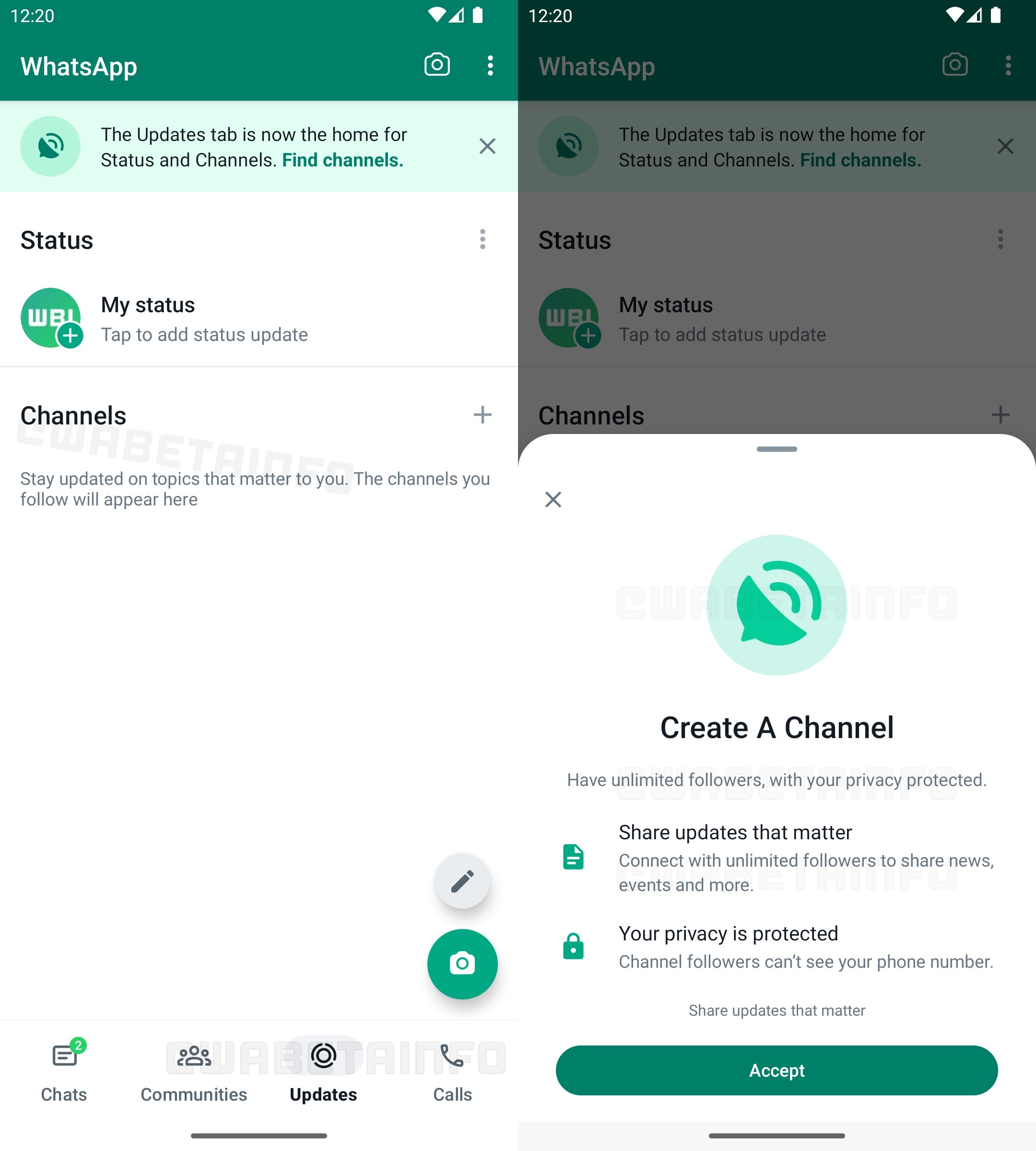 Según lo informado por WABetaInfo, la pestaña de “Estados” sufrirá un pequeño cambio y compartirá el espacio con los canales que vayas suscribiéndote, tal cual como lo demuestra la siguiente captura de pantalla: