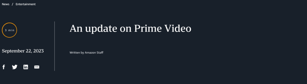 Tal como podemos ver en su página oficial, la compañía ha anunciado que «anuncios limitados» llegarán a las películas y programas de televisión de Prime Video a partir de principios de 2024. La justificación, dice Amazon, es la de «seguir invirtiendo en contenido atractivo y seguir aumentando esa inversión durante un largo período de tiempo.»