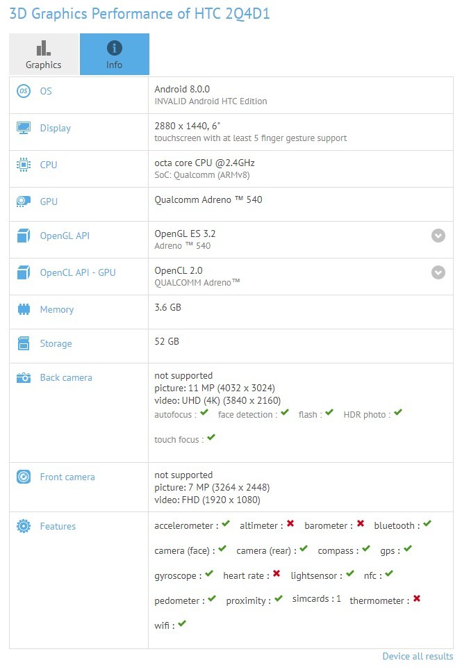 El dispositivo es exactamente el mismo, se trata del HTC 2Q4D1 aunque aquí tenemos varios detalles más. Si este benchmark está en lo correcto, el HTC U11 Plus contaría con las siguientes características: