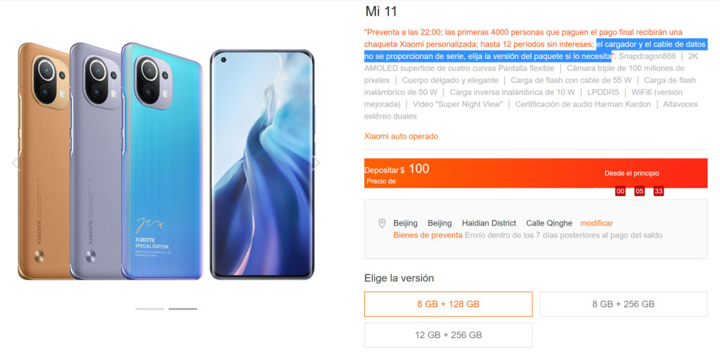 Por si se te dificulta la visualización, allí se indica: «el cargador y el cable de datos no se proporcionan de serie, elija la versión del paquete si lo necesita». Sí, al parecer ni siquiera cable de datos viene en la caja.