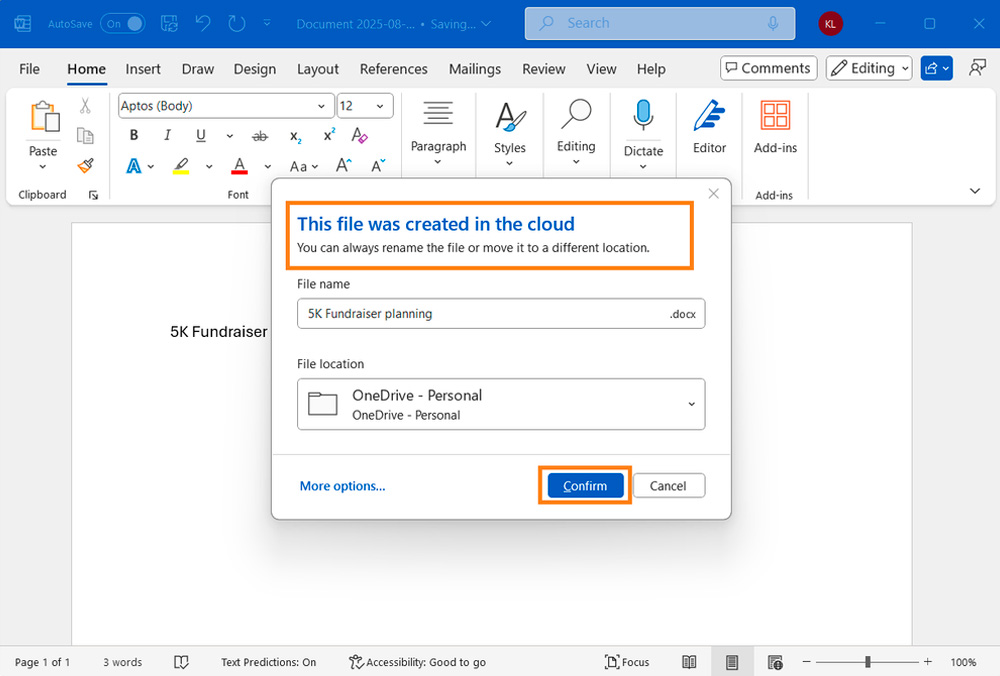 Primero crea un nuevo documento en Word para Windows. El guardado automático (AutoSave) ya estará activado. El nombre del nuevo documento tendrá una fecha en lugar de usar el nombre tradicional, como «Documento1».