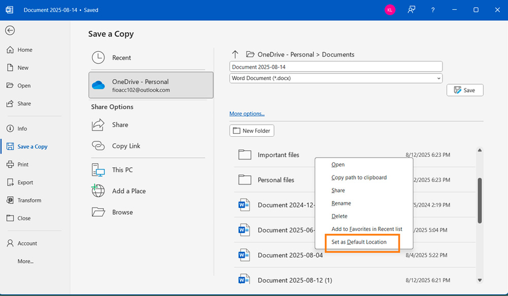 Puedes cambiar la ubicación donde se guardan los documentos nuevos. Haz clic derecho en cualquier carpeta en la nube. Luego, selecciona Establecer como ubicación predeterminada (Set as Default Location).
