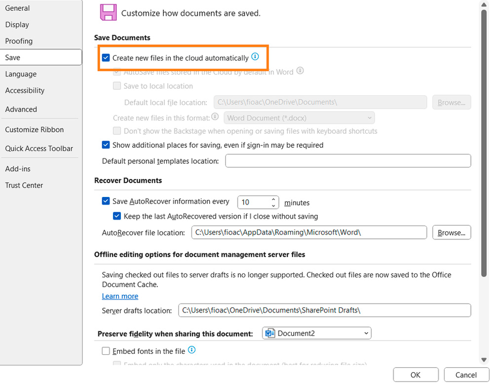 Además, puedes modificar el modo en el cual se crean los archivos nuevos. Esto se hace en las opciones de guardado de Word. Ahí, seleccionas o destildas Crear nuevos archivos en la nube automáticamente (Create new files in the cloud automatically).