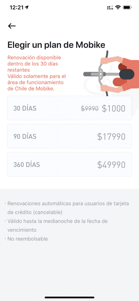 Recuerda que si deseas acceder al pase de 30 días por $1.000, el precio es válido solo para el primer mes, ya que al segundo mes se cobrará precio normal. La oferta es válida a partir de hoy y solo por 48 horas. Si no tienes tarjeta de crédito, Mobike anuncia que puedes usar la tarjeta virtual Mach.