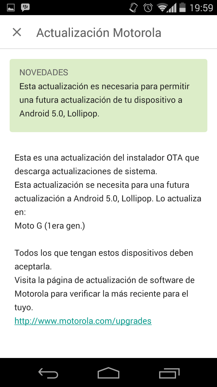Hoy se ha actualizado -valga la redundancia- el servicio de Actualización de Motorola en el Moto G, y el changelog es bastante claro. En este detalla que se está preparando para recibir Android 5.0 Lollipop.