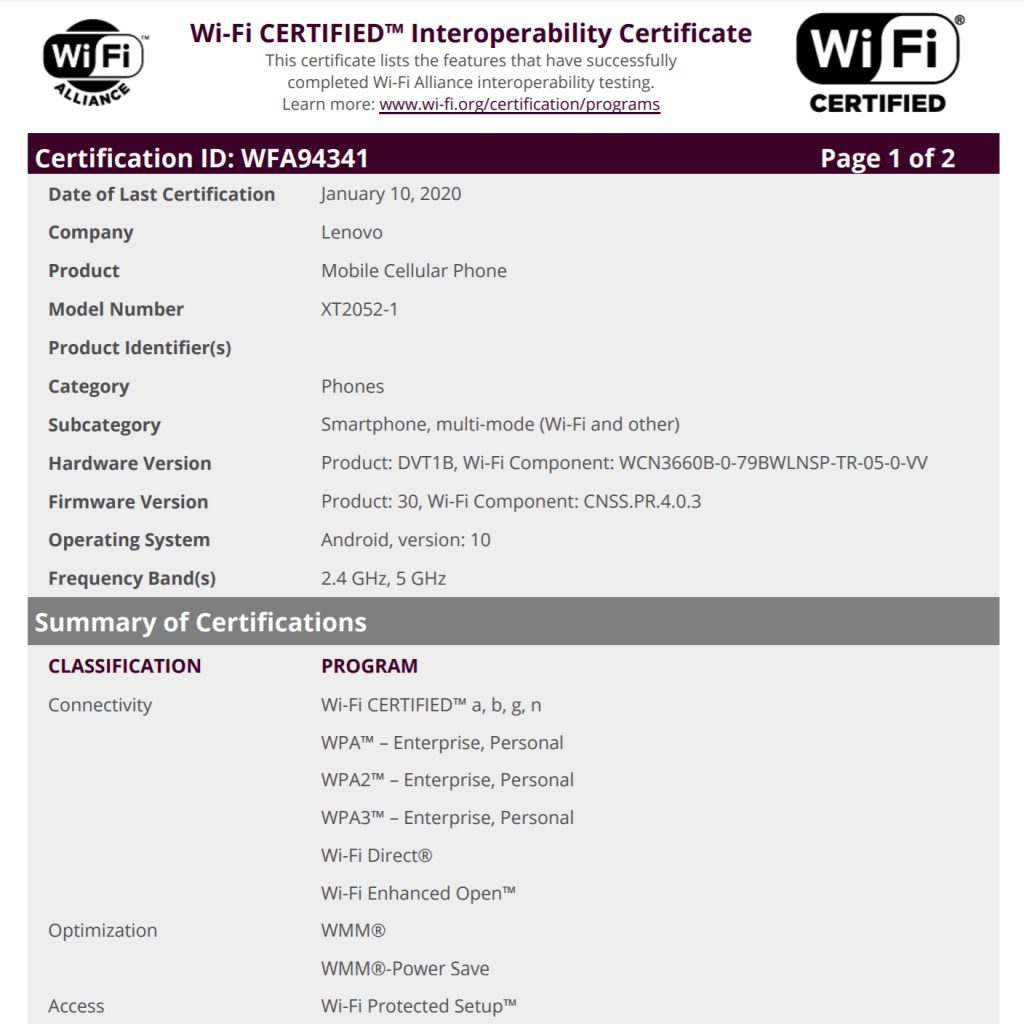 La imagen superior a estas líneas es una captura realizada al documento certificado. En ella apreciamos al dispositivo identificado bajo el número de modelo XT2052-1.